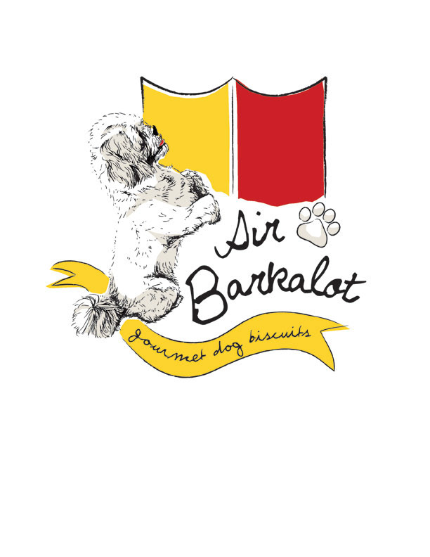 Logo concept for small, local business. For small batch dog biscuits to sell at farmer's market and online. Client's dog as mascot.